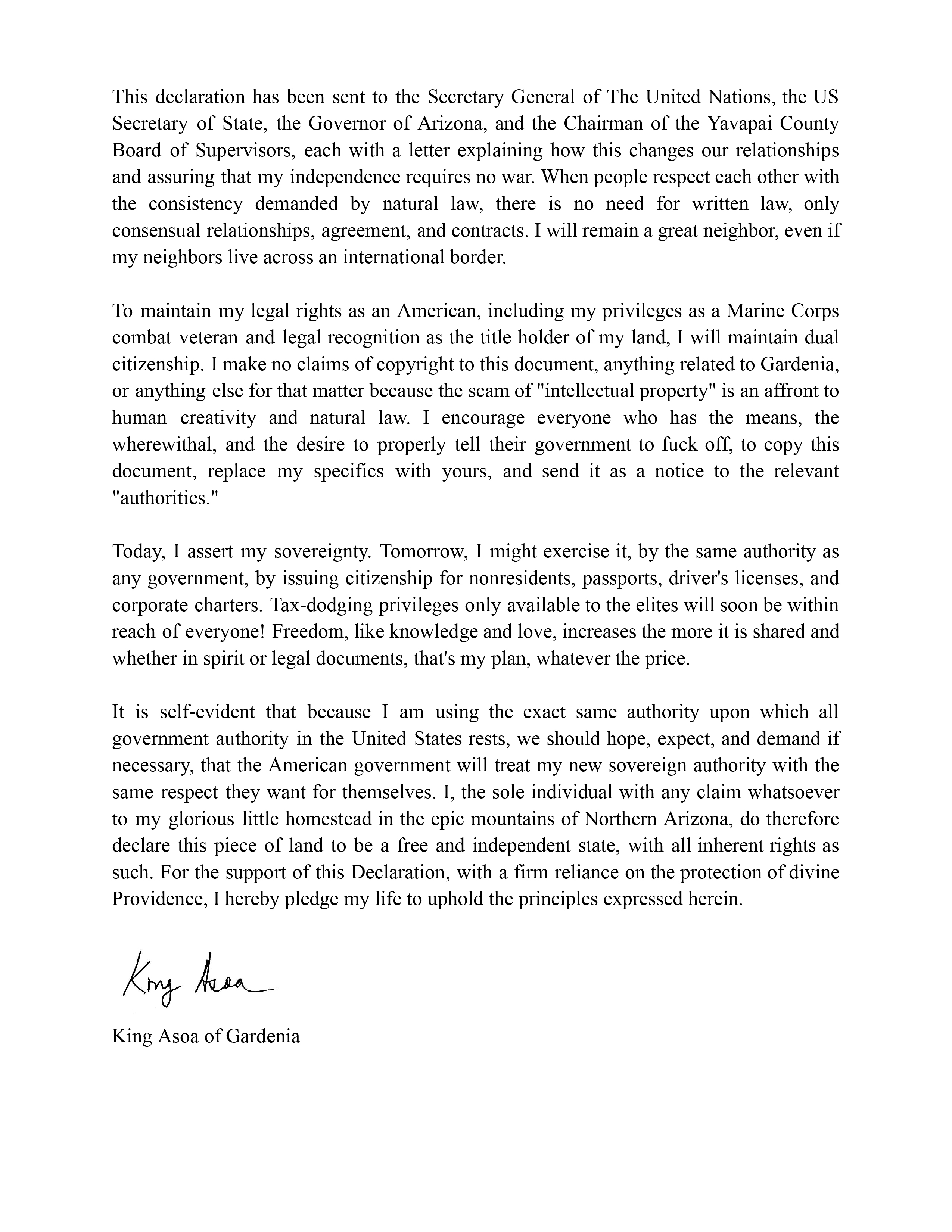 While I have declared my homestead as a sovereign entity, I want to emphasize my desire to be a good neighbor to both the State of Arizona and the United States. I intend to maintain dual citizenship and keep my American legal name, Adam Kokesh. However, in all diplomatic contexts, I would request to be addressed as King Asoa of Gardenia, reflecting the sovereign status I have proclaimed for my homestead.