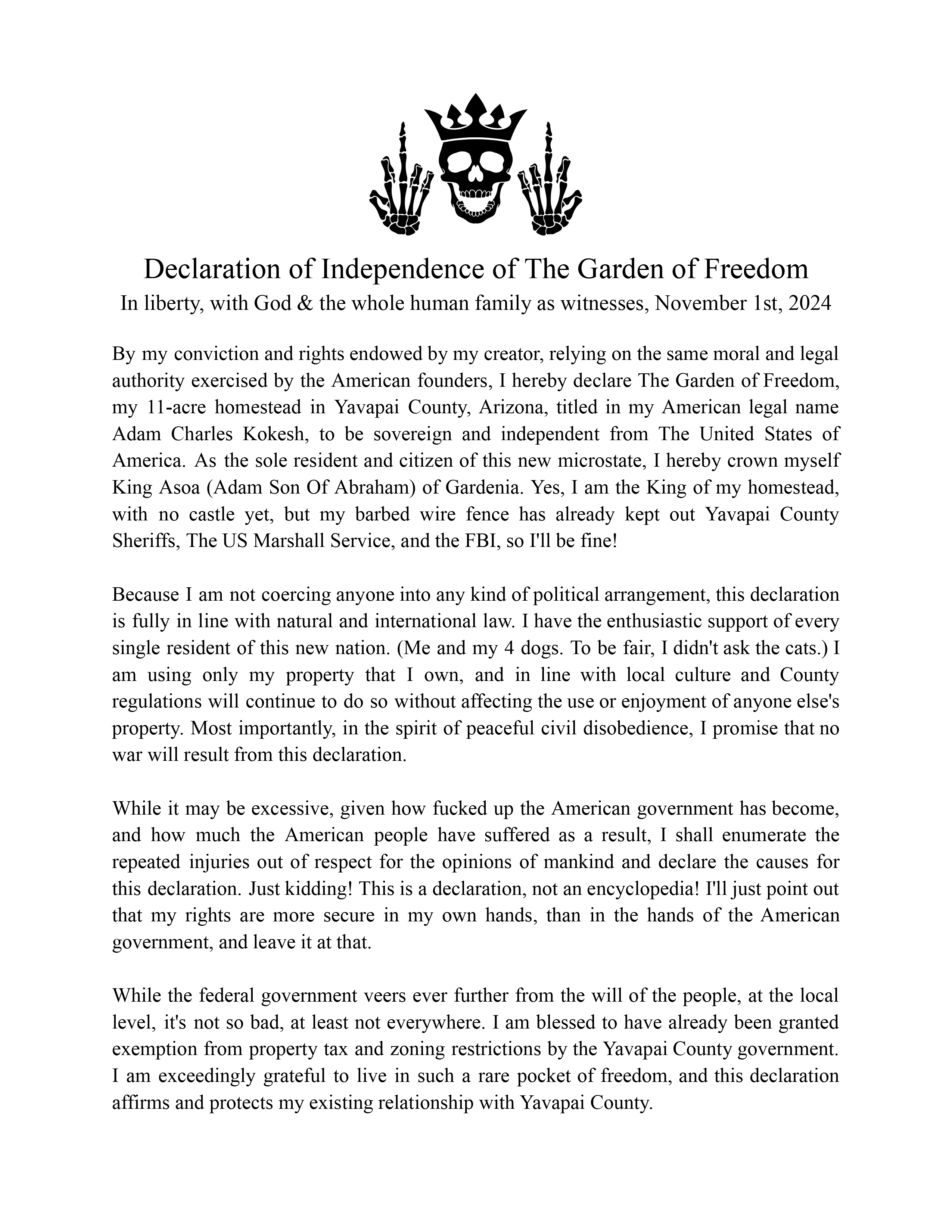 I hope this message finds you well. My name is Adam Charles Kokesh, and I am reaching out to formally submit the Declaration of Independence for my newly established microstate, The Garden of Freedom, located in Yavapai County, Arizona.